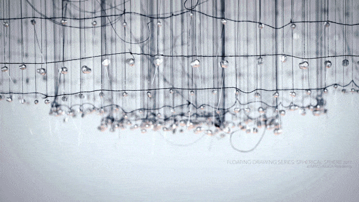 <공중드로잉 시리즈: 구형의 구 no.1> 지름 182 cm, 나일론 섬유, 실, 아크릴 물감 2017