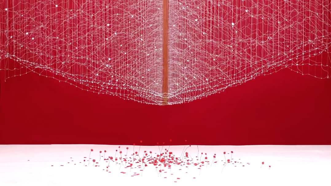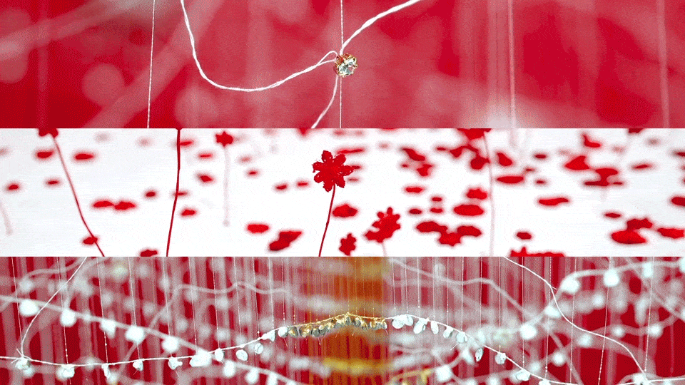 <어머니의 탄생> 240 x 330 x 45 cm, 나일론 & 폴리에스터 섬유, 레이스, 비즈 아크릴물감과 18k 금박 2021