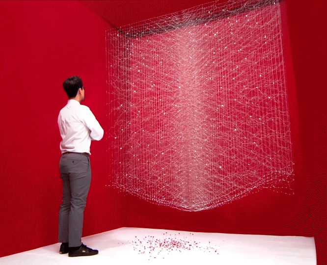 비어있는 큰 공간은 왠지 가슴 설렙니다. 콩돌이 아빠는 전부터 맘속으로 그리던 대형 입체를 만들어 갔습니다. 콘크리트 천정에 구멍을 내어 패널을 매달고 가장 높은 곳에서 가장 낮은 곳까지 실컷 실을 연결해서 하늘하늘 매달린 구조의 부피를 키웠습니다. 전에는 정제된 모양의 반듯한 면들이 겹치도록 작업했는데, 이번 것은 그러고 싶지 않았습니다. 최소한 하단부의 마감은 손이 가는 대로 물결이 오르내리듯 자연스레 묶어내어 층을 이룬 파도처럼 일렁이게끔 했습니다.