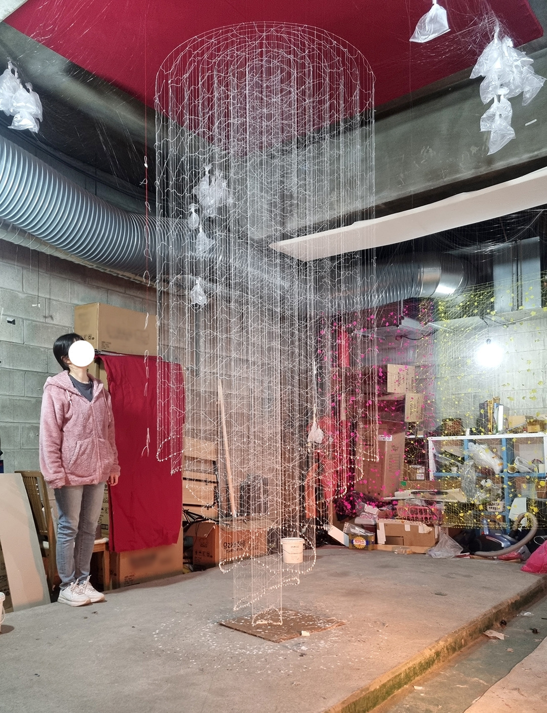 콩돌이가 잠든 후 지하 창고를 향해 내달립니다. 겨울 날씨가 풀리기 전, 급한 마음에 작업실로 향하는 지하주차장 통로를 제 전용 씽씽이를 타고 통과하던 중에 김서린 안경이 배수로 턱을 가렸고 '꽈당' 소리와 함께 제 몸은 뱅글뱅글 돌아 바닥에 고꾸라졌습니다. 작업 중에 먹으려 바짓주머니에 넣어 둔 오렌지는 시멘트 바닥과 허벅지 사이에서 으깨지며 어두컴컴한 지하를 상큼한 과일 향으로 가득 채웠고, 저는 손목을 부여잡고 천장을 보며 소리 내 웃어댔습니다. 절뚝이며 작업실로 들어와 차분히 엄지와 검지로 실매듭을 힘껏 지려했는데, 손등부터 팔목까지 전기가 통한 듯 저려왔습니다. 아마 미약한 골절이 있었던 것 같습니다. 하지만 병원을 들르고 팔을 깁스로 고정하기에는 시간에 쫓기는 통에 그럴 수 없었습니다.