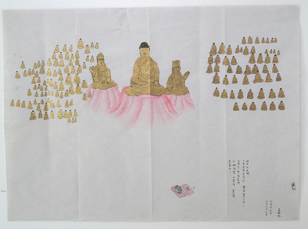 “아니, 웃고 계신 거야. 콩돌아, 아빠처럼 이렇게 엎드려, 그리고 부처님께 ‘부처님, 우리는 행복합니다.’라고 기도해. ”