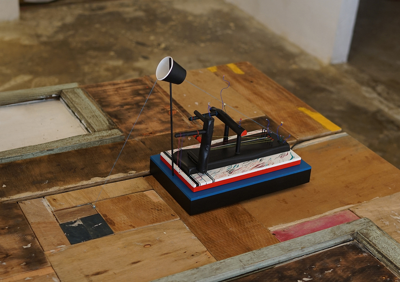 그림이나 입체를 만들어 전시를 하는 사람치고는 손재주가 무딘 편인 내가 낯선 재료인 나무를 이래저래 깎고 이어 붙였다. 콩돌이가 뛰놀던 푹신한 놀이터 바닥, 놀이기구의 곡선과 구조를 어느 정도 흉내 내고, 알록달록한 색깔들을 안으로 숨기고 어두운 내부 공간을 뒤집어 바깥으로 드러냈다. 경쾌한 음악처럼 울려 퍼지는 목소리는 음표, 오선지, 만화의 효과처럼 대충 그려댔고, 구조의 내부에 스피커를 집어넣은 뒤 아주 작은 출력으로 무언가 내가 그간 전하지 못하던 의사를 재생했다. 숨겨진 스피커는 실로 연결한 뒤 밖으로 꺼내어 종이컵 전화기에 이어 붙였고, 굳이 그 말을 들으려는 사람은 잔뜩 허리를 숙이고 집중해야 말소리를 이해할 수 있었다.