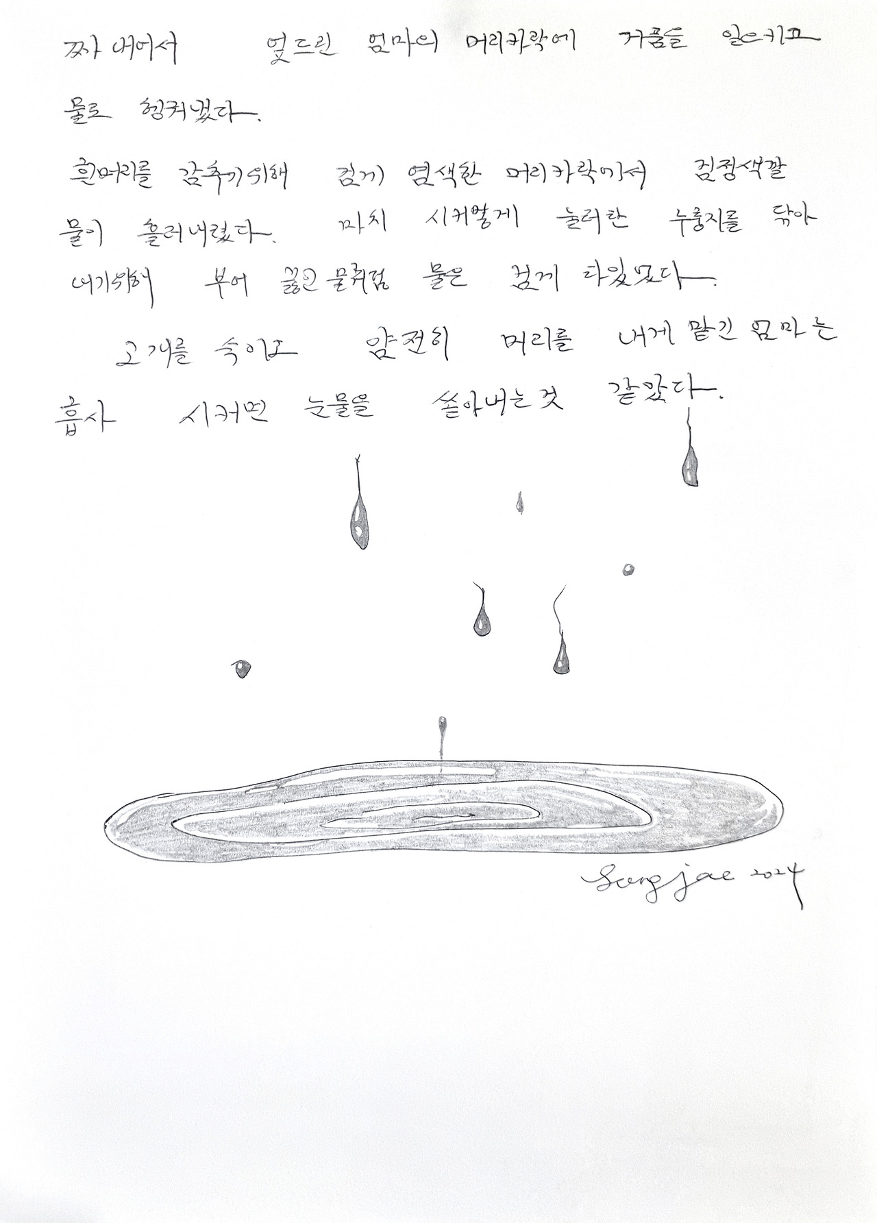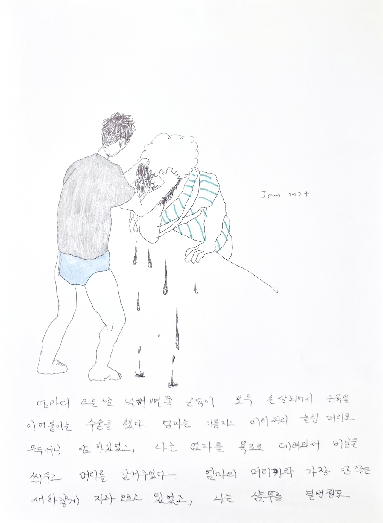 마치 누룽지를 까맣게 태운 냄비를 닦으려 물을 붓고, 끓이고 벅벅 벗겨낸 후의 검은 물처럼, 엄마는 머리를 축 늘어뜨린 채 시커먼 물을 뚝뚝 흘리고 있었다. 그게 왠지 엎드려 눈물을 흘리는 모습 같았고, 그 눈물은 눈에서 흐른 게 아니라 그간 그러려니 하고 살았던 슬픈 일들이 속을 태워 검게 섞여 나온 것 같았다. 한쪽 팔은 꽁꽁 묶어놓은 채 어색한 왼손으로 허우적대는 엄마를 보자 세월의 무상함에 맘이 아프다가 문득 뜻하지 않은 복수를 한 것 같아서 기분이 묘했다. 나는 엄마의 젖은 머리를 수건으로 털어내며 엄마가 내 머리를 감겨주던 무렵의 모습이 떠올랐다.