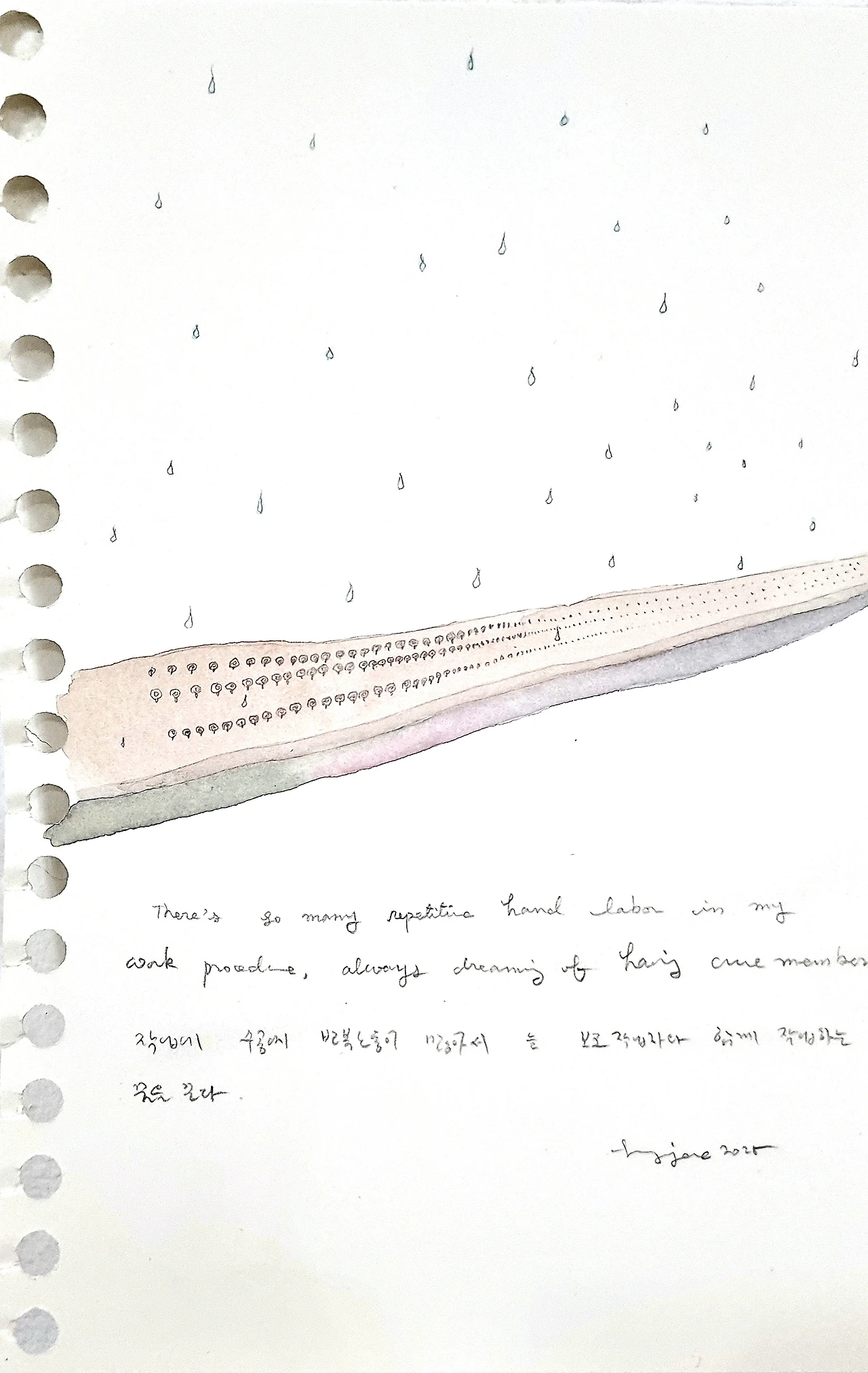 나의 스태프는 가족. 나의 친구는 아내와 아들. 내 작업은 집 청소와 쓰레기 버리기, 그리고 아이와 함께하는 한글과 산수공부... 내가 흠모하는 박수근과 이중섭의 그림에는 진저리 나는 생활의 때가 엉겨있다. 그리고 번듯한 공방과 제작 스테프 없이도 식구들과 숨결을 맞대며 주어진 재료만큼 작업을 이어가던 그들을 되새기며 아직은 혼자 묵묵히, 간간히 가족의 도움을 받으며 내 할 일을 마친다.