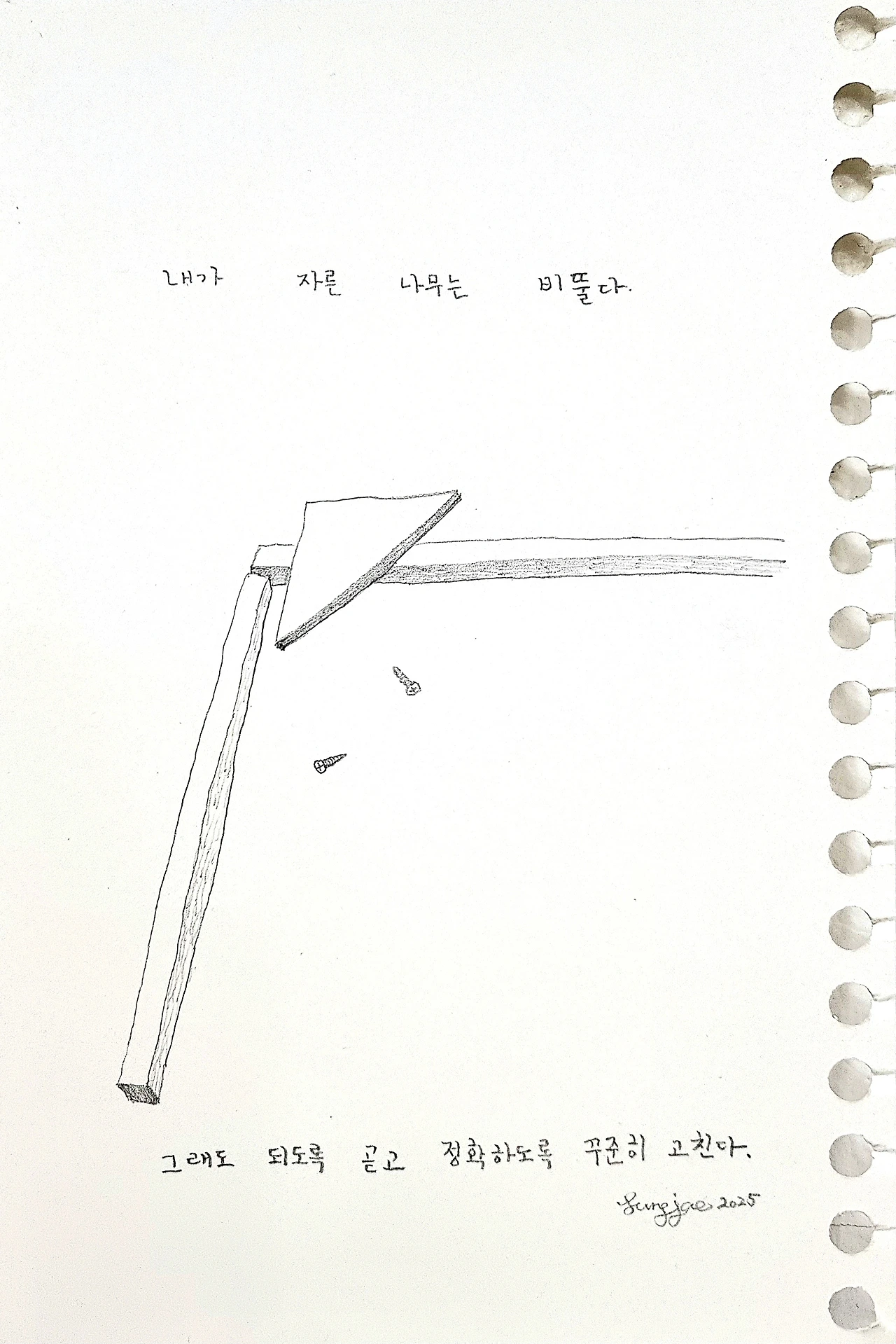 벌써 멋쩍게 첫 미술학원에 발걸음 한 지도 20년이 지났다. 내가 계속 개인작업을 이어갈 것이라는 기대는 추호도 없었는데, 어쩌다 보니 지난달에 또 개인전을 치렀다. 커리어를 시작하던 애니메이션과 미디어아트 작업을 지나 지금은 입체와 캔버스작업까지 하고 있는데, 덕분에 해본 적 없던 톱질이나 콘크리트 드릴질도 해내고 있다. 여전히 내가 자른 나무는 미세하게 경사져있고, 내가 고정한 콘크리트벽 앵커는 스스로도 그 안정성이 미심쩍다. 항상 머릿속에 떠올린 반듯한 직각의 구조물과는 달리 내가 조립한 틀은 어딘가 엉성해서 수차례 다시 만들다가 마감에 쫓겨 그중 나은 것을 사용하는 타협을 보곤 한다.