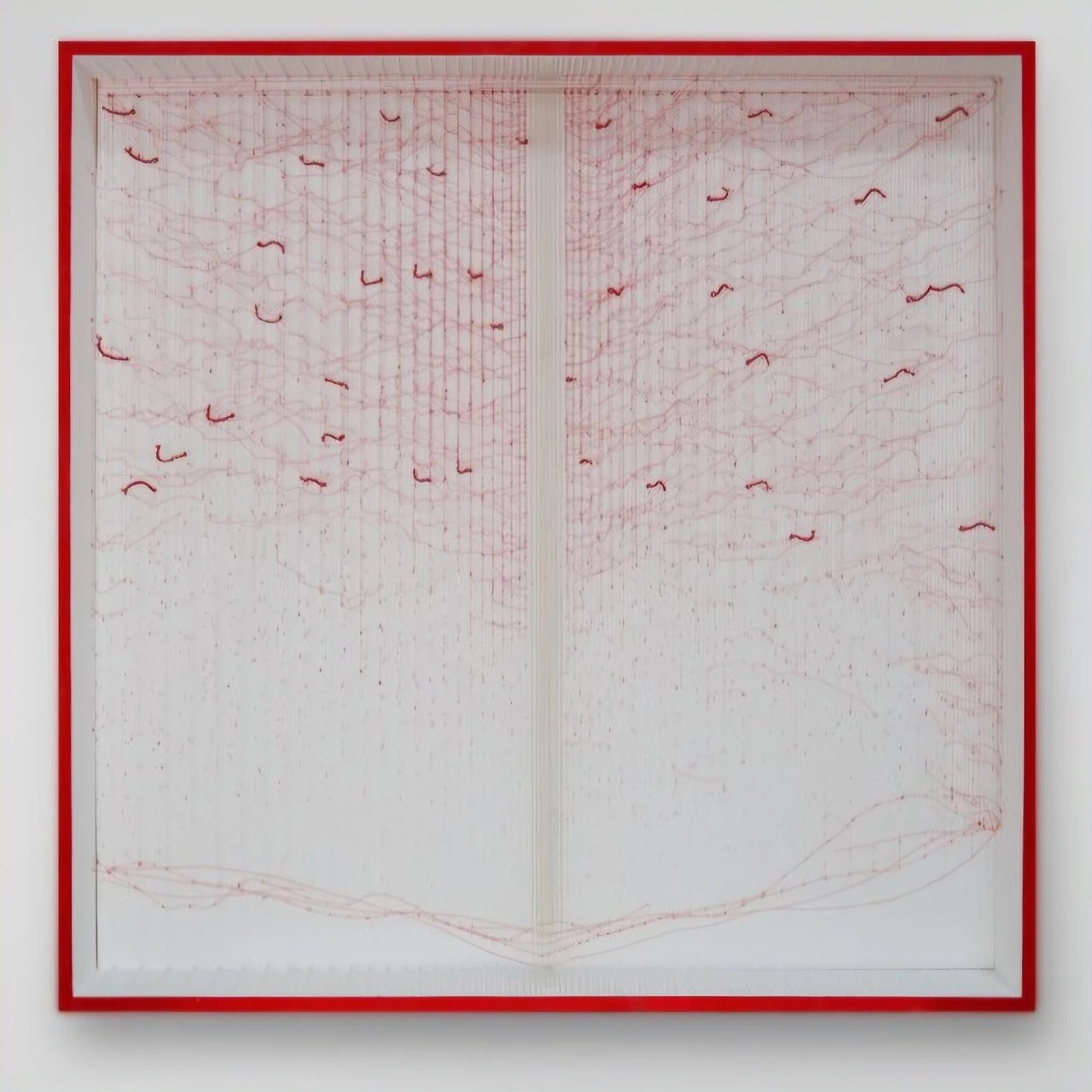 없던 방을 만들었다. 그리고 그 안에 안정적으로 훅을 고정한 뒤 와이어를 묶는다. 위로 아래로 반복되는 작업을 하며 잡념이 사라지는 구간에 돌입했다. 섬유 구조물을 외부에 노출시킨 기존 작업을 틀 안에 넣어 압축된 형상을 만들고 밀도를 올린다. 그리고 생에 첫 방문을 열며 번져가는 웃음을 참을 수 없던 나의 얼굴처럼 팽팽히 간격을 유지한 선들이 정갈히 줄지어 드로잉이 되어간다. 투명아크릴로 그 전체 틀을 덮어 마감한 순간, 오래간 실랑이를 벌여오던 나의 설치과정이 초대하는 사람과 스태프의 입장에서 얼마나 큰 부담이었을지를 깨닫는다.