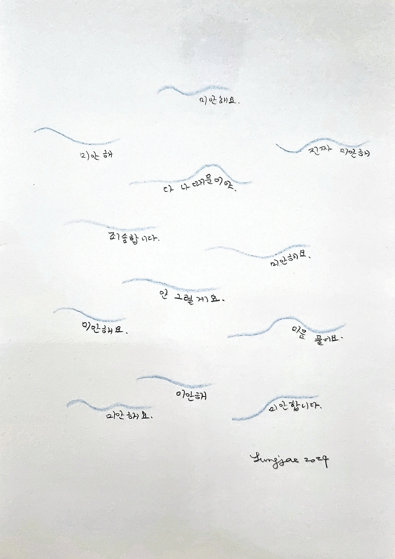 내가 만든 작업을 바라보는 어른들의 눈을 살핀다. 작가로서 당당해야 하는 게 맞는지, 어른의 역할도 아이의 역할도 어색해져 버린 내가 얼굴에 떨림을 숨기지 못하고 활짝 웃으며 반색해 드려야 하는 게 적절한지, 순간순간 처세에 갈등이 인다. 좋은 평가는 작업에 주어지는 것이 인지상정이지만 괜히 예의와 공손한 태도에 맘이 기울지는 않을까 내심 기대를 하며 나는 다시 귀염둥이가 되려 한다. 내가 어른이 될 수 있을까? 나도 언젠가는 사사로운 관계를 벗어나 초연 할 수 있을까?