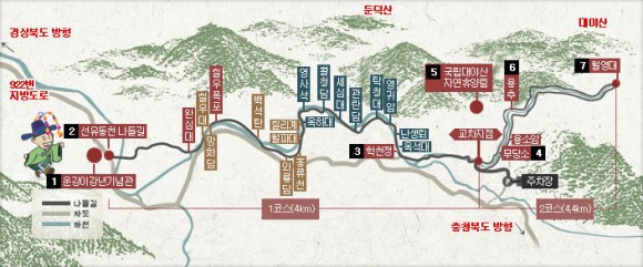 대야산 깊은 골짜기는 이젠 문명과 자연이 공존하는 길이 됐다. 들머리엔 현대적 건축미학이 돋보이는 펜션이 들어서고 식당이 성업 중이다. 원치 않아도 세상은 그렇게 변했다. 길도 달라졌다. 편리하게 걷기를 원하는 도보여행객들을 위해 황톳길, 데크로드 길, 숲길, 수변 감상 길이 조성됐다.