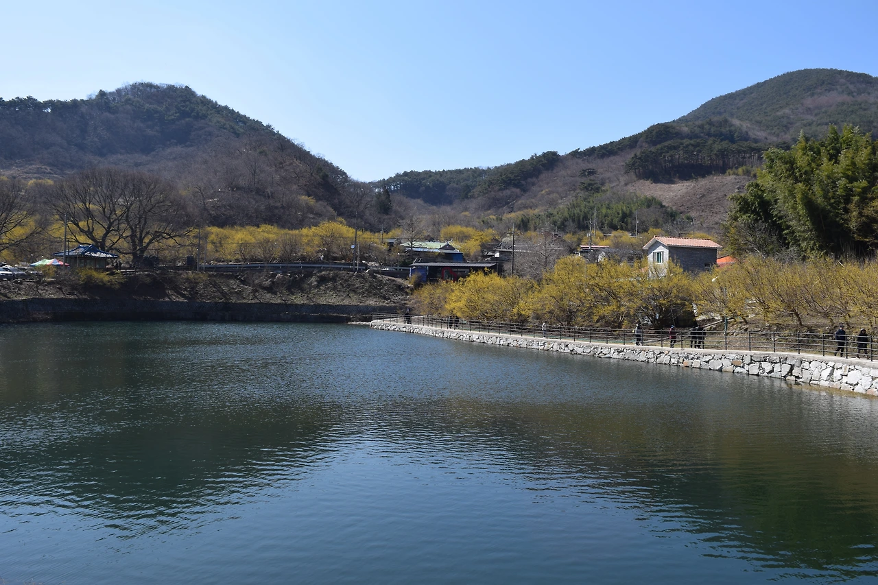 (온통 산수유로 둘러싸인 현천마을 앞 저수지)
