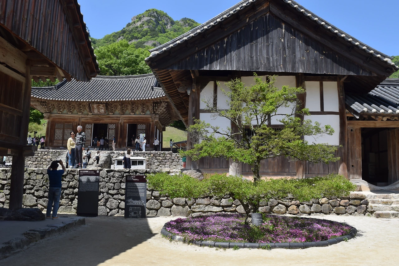 절 입구에 사열하듯 서있는 4월의 전나무숲도 아름답고 팔작다포집으로 지은 대웅전도 고풍스럽지만 봉래루(蓬萊樓) 앞의 수령 수백 년 느티나무의 등걸 사이로 보이는 기와지붕의 화음에 시선이 끌린다.