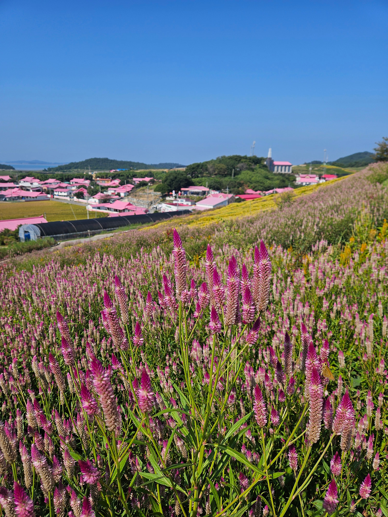 보기선착장에서 셔틀버스로 7분 거리의 언덕에 절정을 살짝 지난 맨드라미 군락이 바다를 향해 미모를 뽐내고 있었다. 섬 주민들이 3년간 황무지 야산을 개간해 일군 수천 평의 꽃밭이다. 보기선착장에서 안내를 맡은 한 주민은 올해는 폭염 때문에 '때깔'이 작년보다 못하다고 했지만 아쉬울 정도는 아니었다.