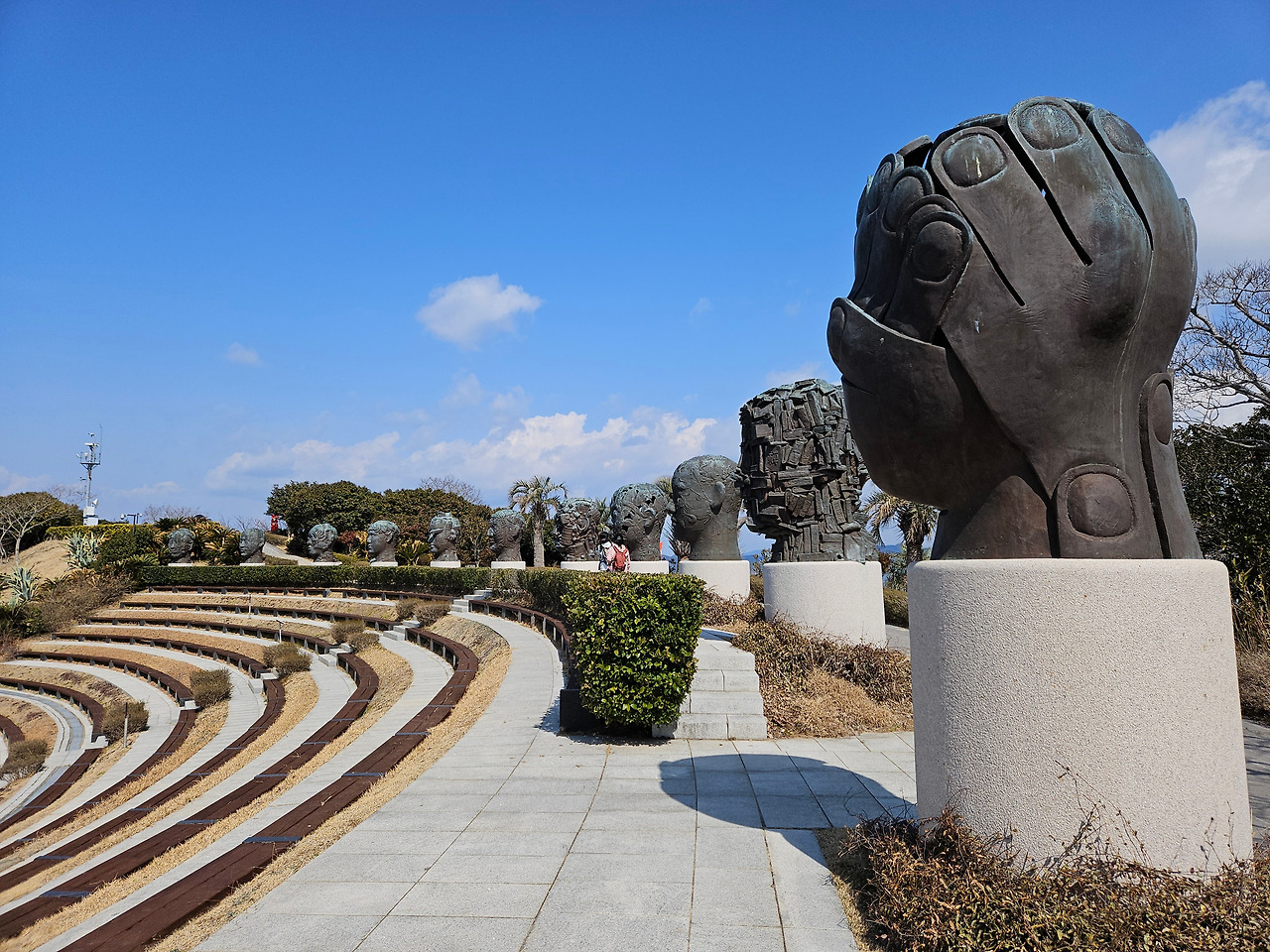 탐방객들은 주로 노란 불빛과 동백꽃이 조화를 이룬 어두운 동백터널에서 인증샷을 많이 찍지만 개인적으론 김정명 작가가 청동으로 만든 12개의 큰머리 군상이 굽어보고 있는 야외음악당이 인상적이었다.