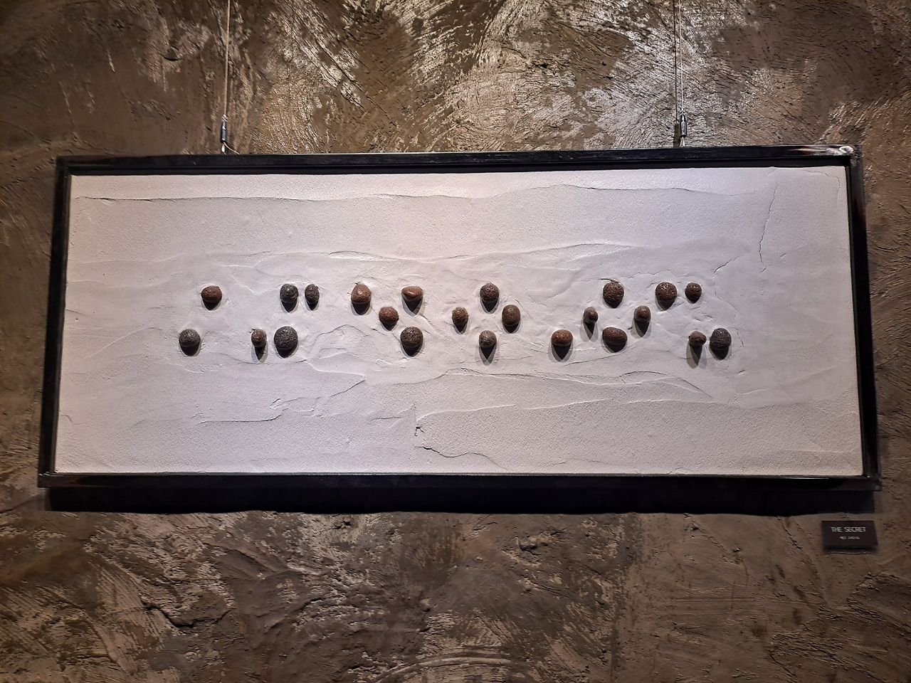 마치 모래사장을 표현한 듯 거친 질감의 하얀색 바탕에 작은 조약돌 13개가 멀리서 보면 잔잔한 바다위 물결처럼 점점이 박혀있는 입체회화 작품이 가로로 긴 액자에 담겨있다. 작품은 단순해보이지만 사유(思惟)를 이끌어내는 아우라가 있다. 조각가이자 목사인 장동근 작가의 작품 ‘THE SECRET’ 연작중 하나다.