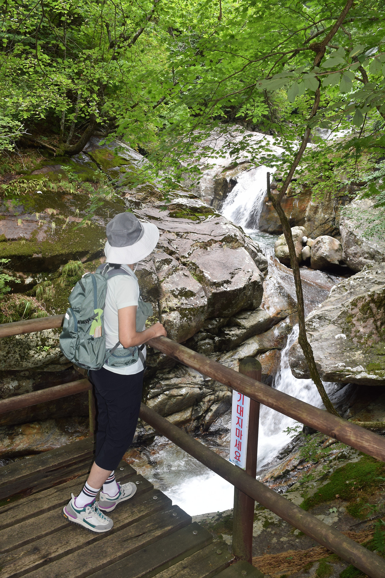 무엇보다 한신골은 첫나들이, 가내소, 오층 등 크고 작은 폭포가 구술 꿰듯 이어진 골짜기다. 국립공원이라 안전시설이 완비돼 폭포에 접근할 수 없지만 산허리를 걸으며 폭포를 내려다볼 수도 있고 데크전망대에서 올려다볼 수도 있다.