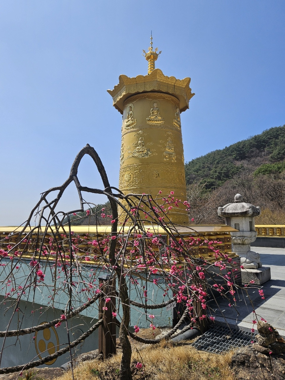 금빛 마니차 주변엔 홍매화와 노란 털방울같은 생강나무 꽃이 흐드러지게 피었다. 문수보살상앞에선 운해도 볼 수 있다는데 이날은 구례읍과 와산 사이로 잔잔히 흐르는 섬진강만 보였다.