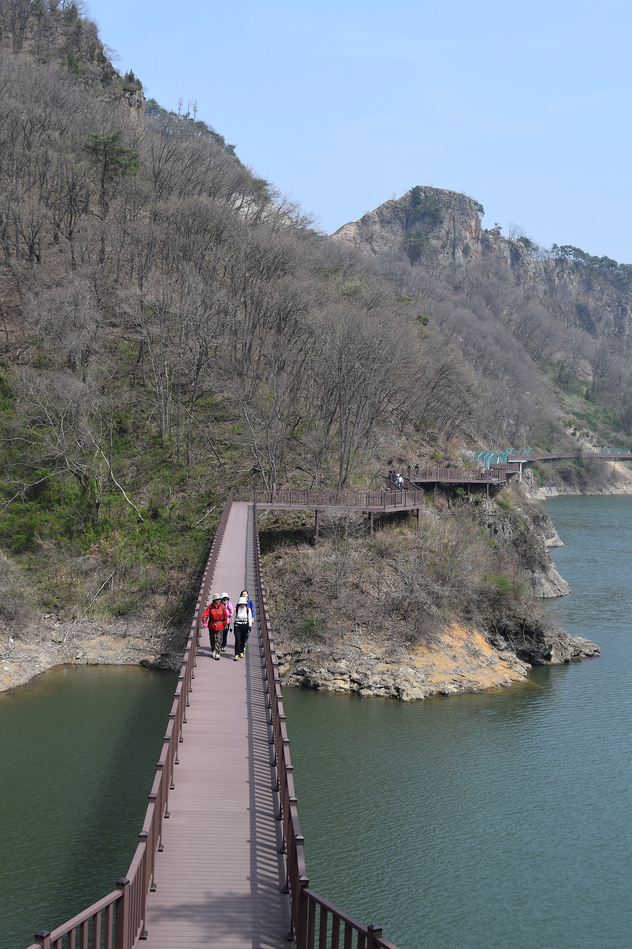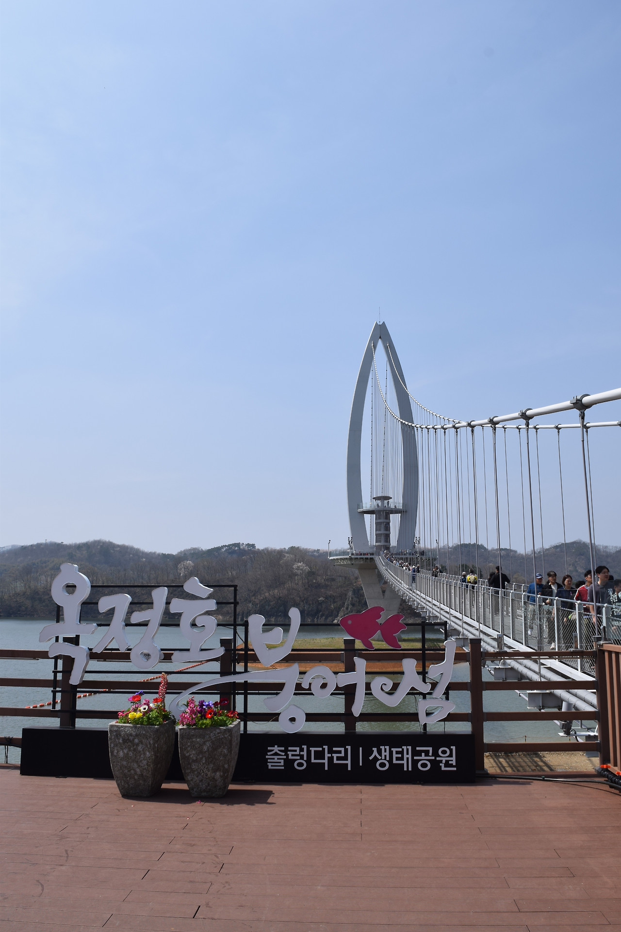 데크길을 걸어 40여분 만에 도착한 출렁다리앞 광장은 마침 벚꽃축제 개막과 겹쳐 탐방객들로 인산인해다. 가설무대에선 잡다한 음악소리가 귀청을 때린다.