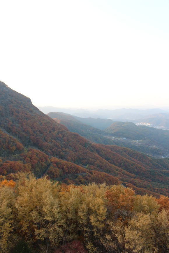 산상호수 전망대에서 바라본 파스텔톤의 적상산 자락.