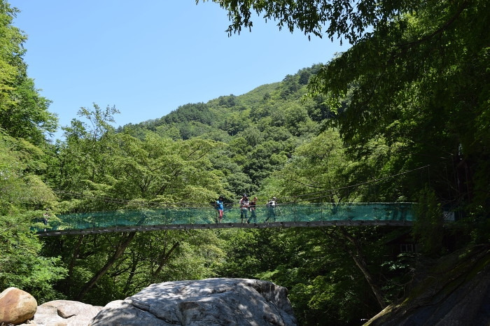 계곡을 넘는 첫 번째 다리가 칠선교다. 2011년 태풍 무이파에 의해 다리가 일부 파손돼 새로 시공했다. 며칠 내린 비로 풍성한 물줄기는 굉음을 토해 냈다. 다리 건너 전망 좋은 추성 망 바위를 지나면 경사가 심한 산길로 접어든다.