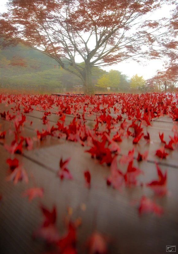 물이 바랜 듯한 단풍나무만 보다가 갑자기 산뜻한 단풍잎이 지천에 깔린 철새전망대를 지나면 들머리인 앙성온천으로 이어진 시골의 ‘둑길’로 접어든다.