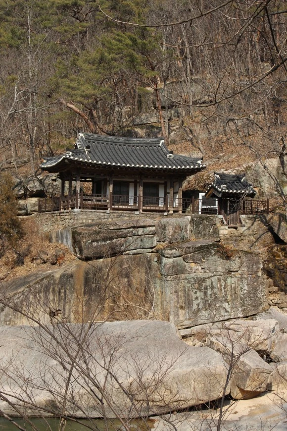 들머리인 화양 펜션 계곡 건너에 우암이 강학(講學)을 하기 위해 지은 암서재(巖棲齋)가 눈길을 잡아끌었다. 절벽 중간에 걸터앉은 서실은 언제 봐도 정갈한 모습이다. 정명 4칸 후면 2칸의 아담한 서실인데 마루에 앉아 계곡을 바라보면 풍경이 일품일 터다. 암서재 부근 바위에는 명나라에 대한 불변의 의리를 상징하는 비례부동, 충효절 같은 바위글씨가 남아 있다. 송시열은 암서재를 제목으로 한시도 지었다.