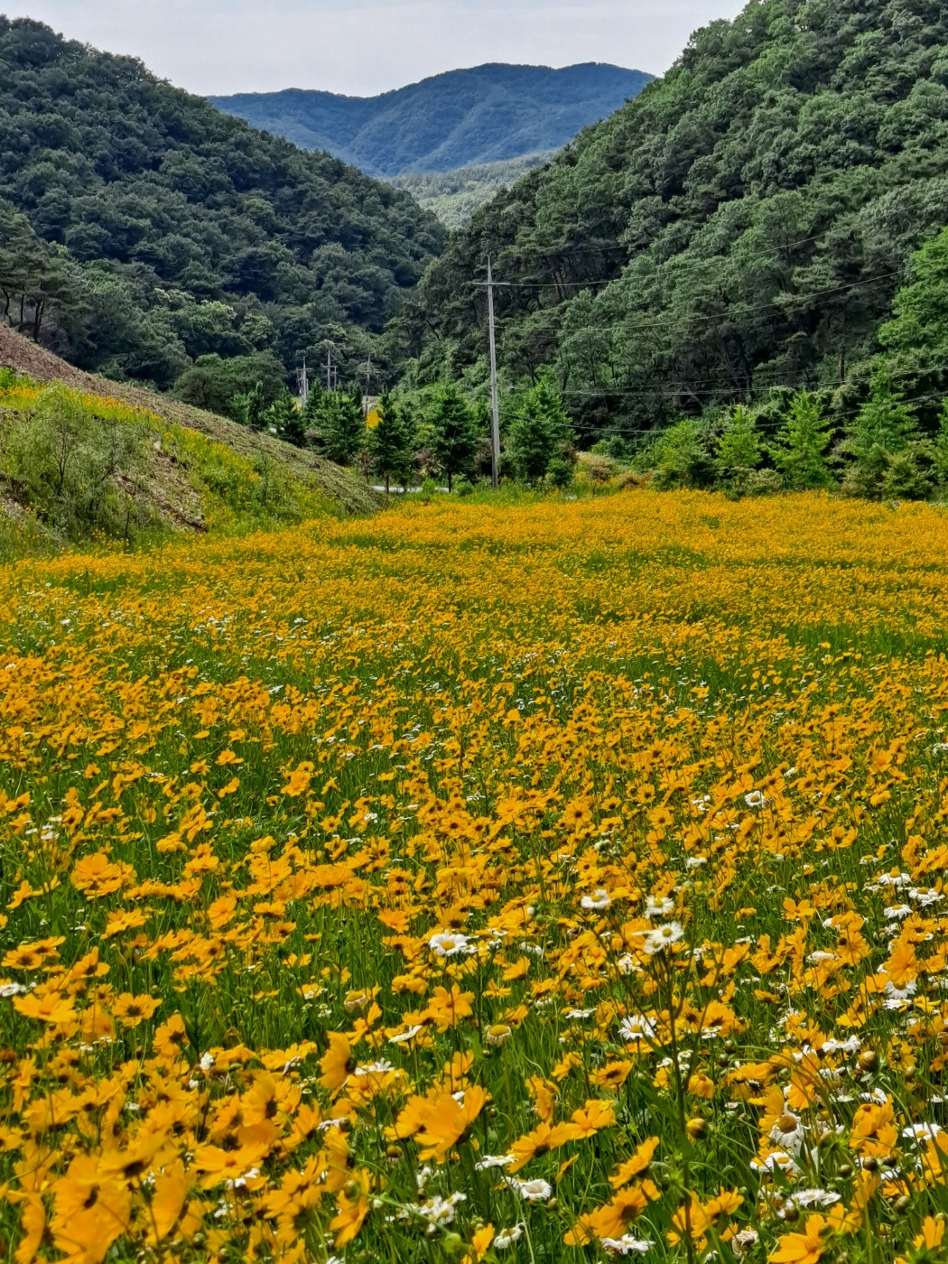산밑에 난 길 입구는 소나무가 울창해 오솔길만큼이나 좁지만 좀 더 진입하면 넒은 구릉지가 월리사까지 펼쳐진다. 금계국은 수만평에 달하는 구릉지에 황금물결을 이루고 있다. 온통 노란색이 구름 한점 없는 파란 하늘과 아름다운 조화를 이루고 있었다.