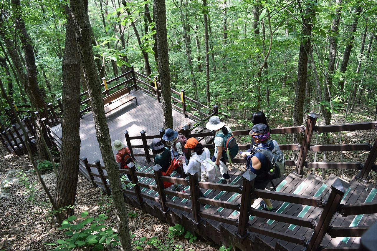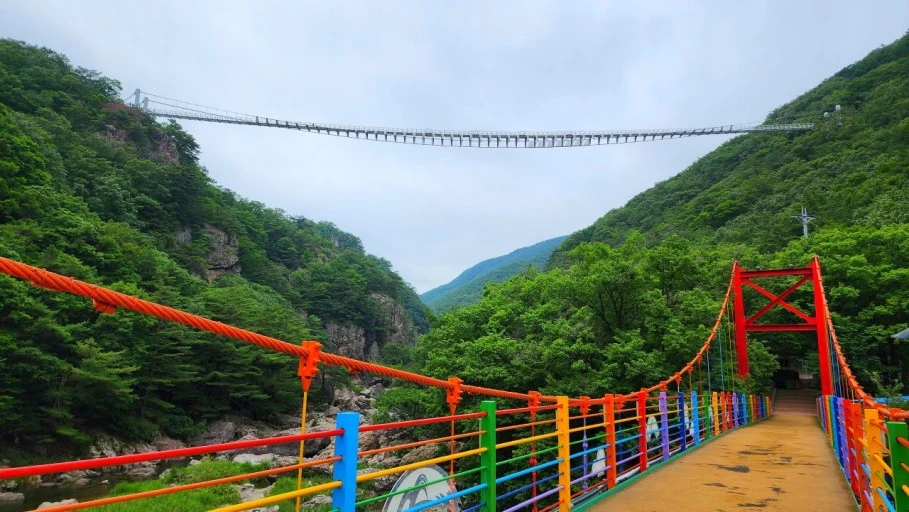 구름다리를 건너 원시림처럼 나무가 빽빽한 숲속을 마치 산림욕하듯 내려가는 테크계단길 풍경도 일품이다. 이 길을 내려가면 초록이 우거진숲에 일곱빛깔 페인트로 포인트를 준 ‘무지개다리’를 건너게 되는데 이 다리에서 위를 쳐다보면 ‘구름다리’가 하늘에 걸린듯 까마득해 보인다. 그리고 바로 주양교로 가는 그늘 짙은 계곡데크길로 이어진다. 여기까지만 걸어도 일단 본전은 뽑는다.