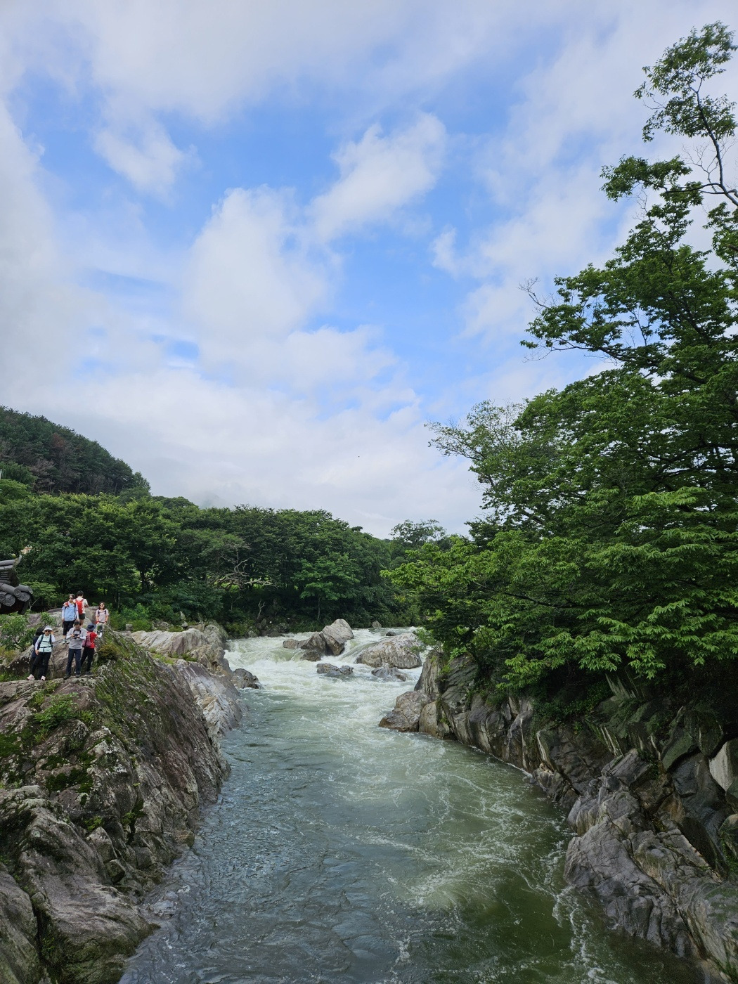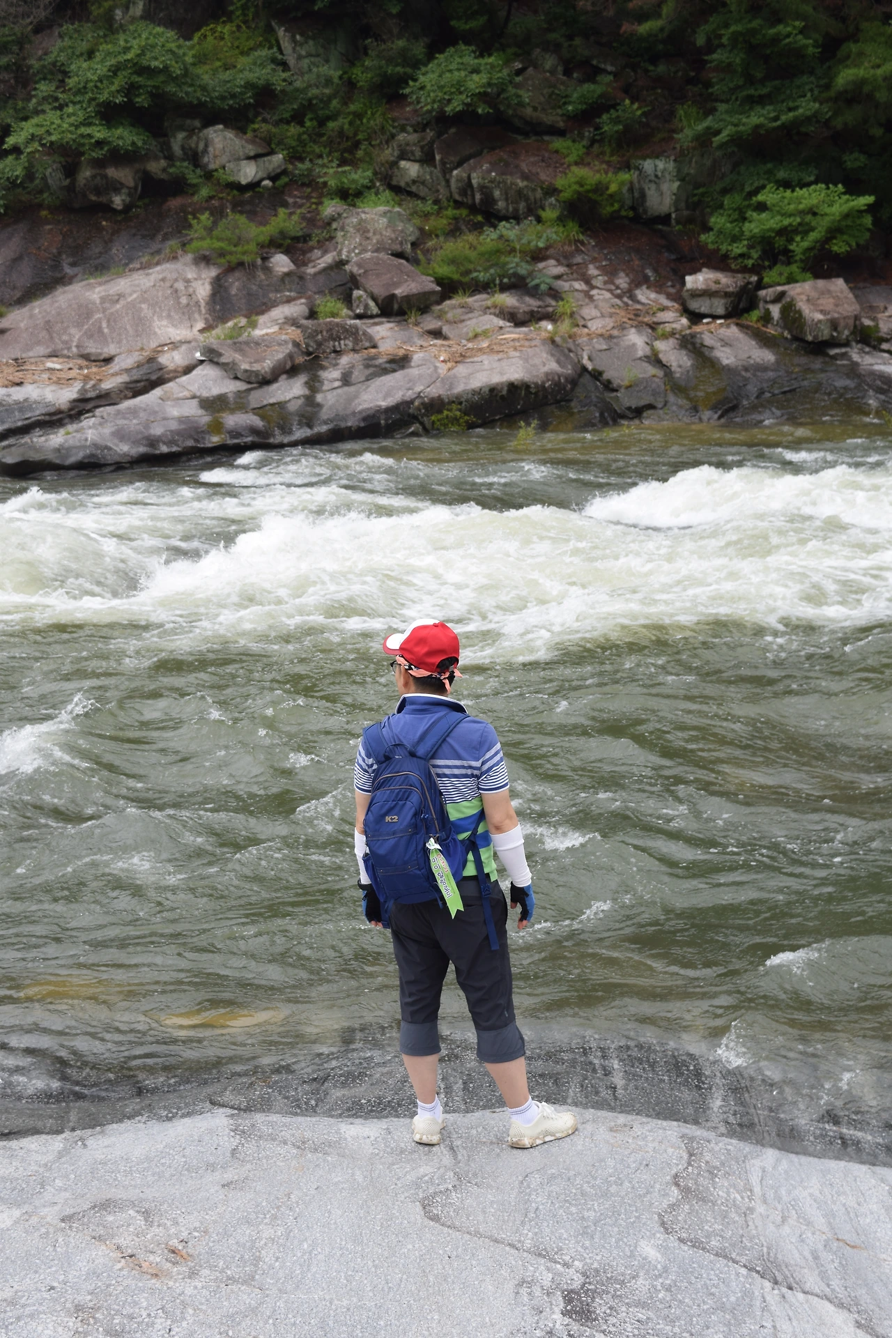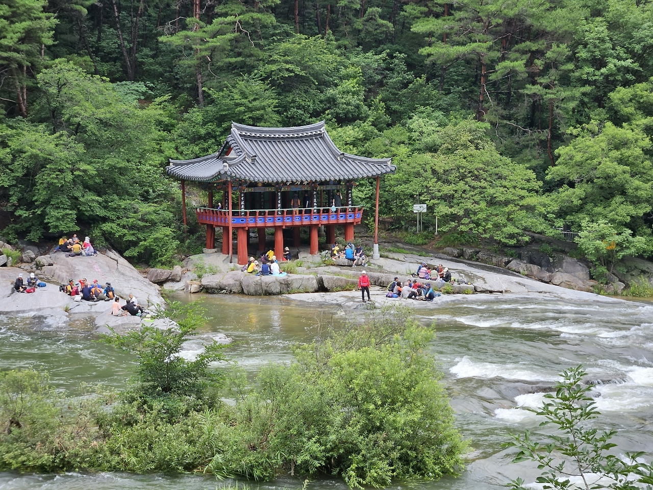탐방로는 ‘팔담팔정(八潭八停)’으로 유명하지만 1코스의 거연정 다음 정자는 영귀정, 동호정이다. 동호정으로 가는 길은 그늘 짙은 계곡옆 테크로 말끔하게 정비돼 걷기가 편하다. 길옆 산비탈에는 폭포처럼 물이 쏟아져 계곡으로 흘러갔다. 두런두런 일행과 대화를 나누며 걷는데 영귀정은 찾을 수 없었지만 계곡너머 옥녀담 옆에 커다란 동호정이 보였다.