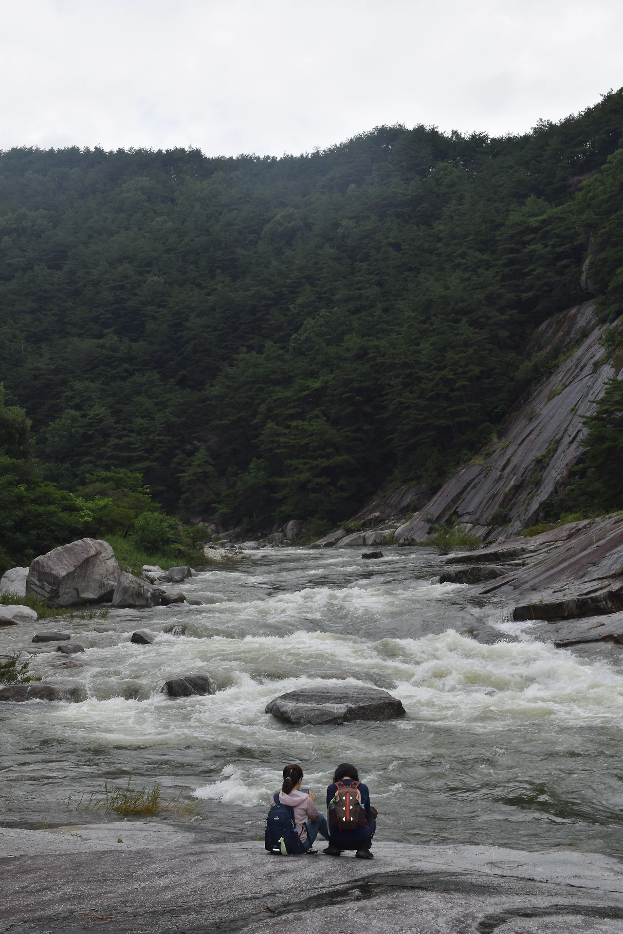 바위를 중심으로 상류와 하류가 15도 각도로 꺾어진 좌우측에 광활한 풍경이 펼쳐졌다. 브래드 피트 주연의 영화 ‘흐르는 강물처럼’에 나오는 몬테나주의 강처럼 우뚝 솟은 산을 휘감아 돌며 하류를 향해 거칠게 내달리는 계류가 일품이다. 이곳에서 플라이낚시를 하면 고기가 잘 잡힐지도 모른다.