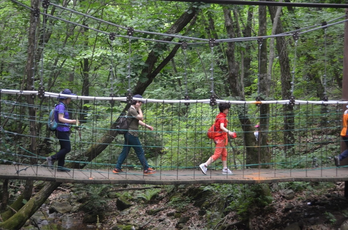 하지만 전혀 가공되지 않은 자연 그대로의 계곡길이 펼쳐진다. 질박한 길이다. 울퉁불퉁한 돌길옆에는 매 순간 독특한 정취를 자아내는 계곡이 시각과 청각을 흔들어놓는다. 길을 걷다가 맘에 드는 너른 바위에 배낭을 풀고 굉음을 내며 아래로 쏜살같이 흐르는 물을 바라보며 유유자적 정담을 나누거나 간식을 먹는 사람도 많았다.