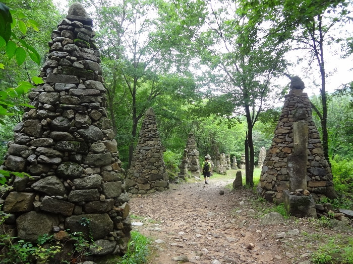 얼음골 생태길은 자드락 2코스 정방사길과 접해있다. 능강교에서 하차하면 바로 갈림길이 보인다. 들머리는 계곡을 끼고 있는 숲이 우거진 평탄한 오솔길이라 그늘이 짙었다. 조그마한 돌을 하나하나 쌓아놓은 돌탑 수십 개가 나그네들을 기다리고 있었다. 짙은 초록 숲길에 살랑살랑 선선한 바람이 불었다. 산길옆으로는 단풍나무가 사열하듯 서있었다.
