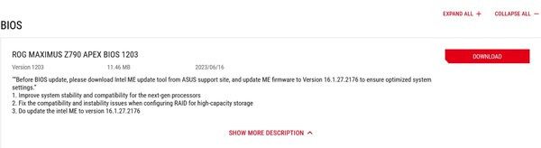 ASUS의 경우, 최고급 모델인 ROG Maximus Z790 APEX는 14세대 코어를 지원하여 시스템 안정성과 호환성을 향상시켰다. 또한, ASRock의 업데이트와 마찬가지로 인텔 ME(Management Engine)도 최신 버전으로 업데이트된다.