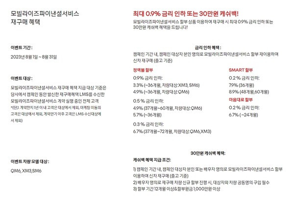 또한, 8월에 QM6 퀘스트를 구매하는 고객은 한 번 재구매 시에는 최대 310만원, 여러 번 재구매하는 고객은 최대 390만원의 혜택을 받을 수 있다.