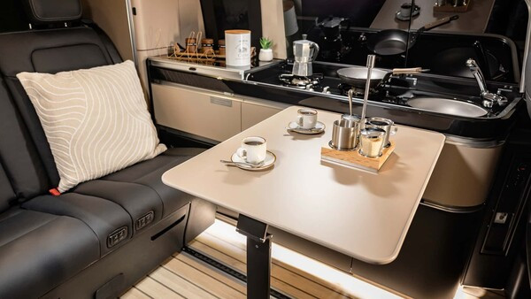 2열 좌석은 전후로 이동이 가능하여 공간을 유연하게 활용할 수 있으며, 주방에는 가스 레인지 같은 편의 기능이 포함되어 있다.