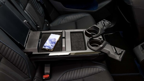 또한, 2열 암레스트에는 컵홀더 부분의 장치를 터치하면 스마트폰이나 태블릿을 세울 수 있는 스탠드가 나타나는 특별한 기능을 보여준다.