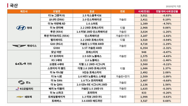 이 데이터는 엔카닷컴의 빅데이터 분석을 기반으로 하여 현대, 기아, 르노삼성, KG모빌리티와 같은 국내 브랜드뿐만 아니라 벤츠, BMW, 아우디와 같은 외제차 브랜드의 2020년식 차량 가격을 조사한 것이다.