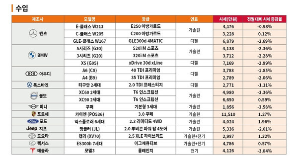 또한, 아우디 A6 (C8) 40 TDI 프리미엄과 폭스바겐 티구안 2.0 TDI 프레스티지 역시 가격이 1%대로 소폭 하락한 것으로 나타났다.
