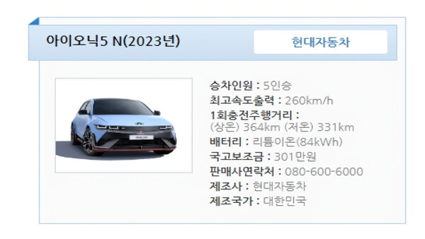 무공해차 통합누리집의 정보에 따르면, 아이오닉5 N은 301만 원의 국고보조금을 받게 된다.