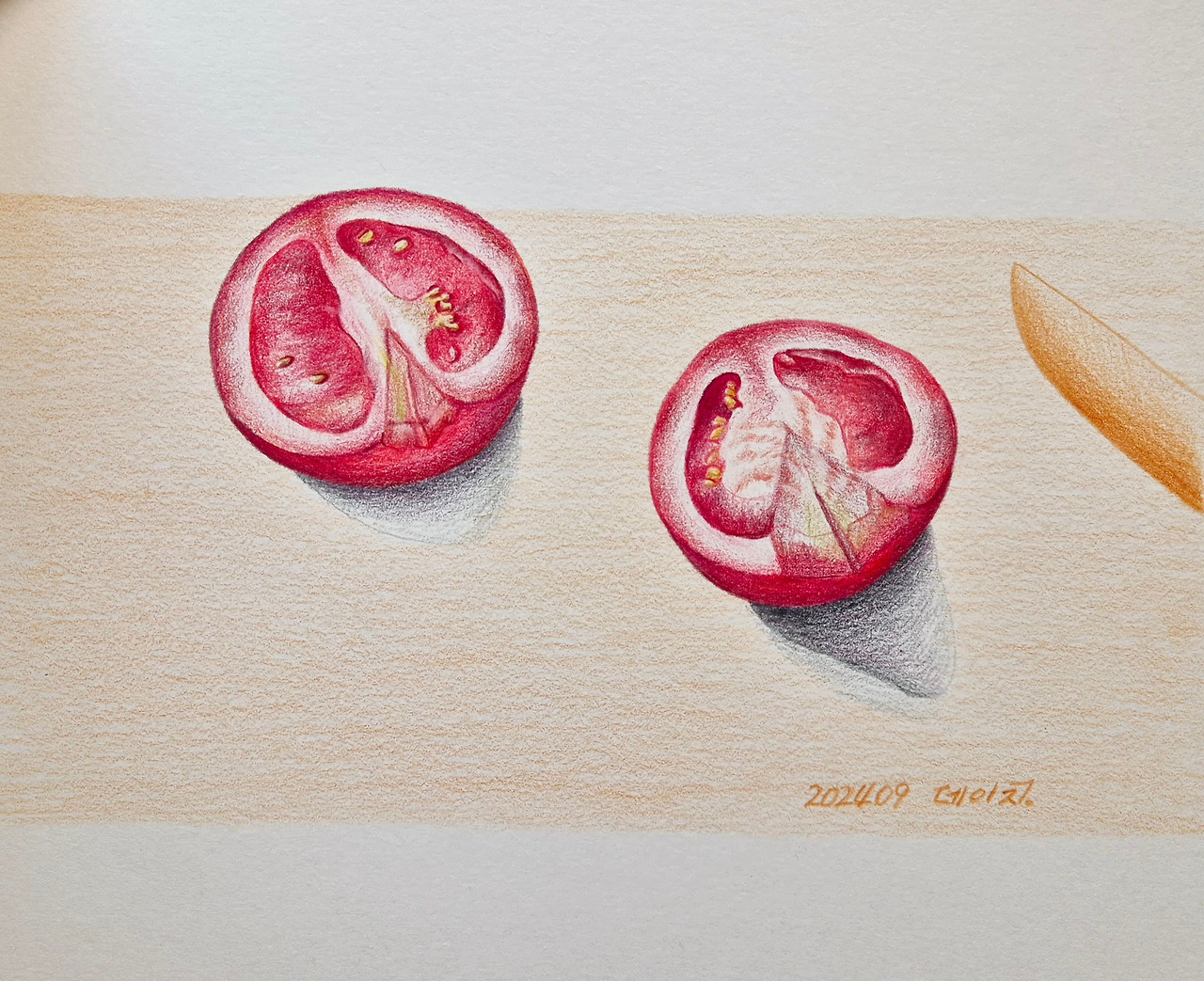 남편이 샤워를 하는 소리가 귓가에 들린다. 일어날까? 조금만 조금만 몇 번을 뒤척이다 침대에서 나왔다. 제대로 떠지지 않는 눈을 비비며 냉장고 문을 열어 토마토 3알을 꺼냈다. 식초물에 담가 씻고 도마와 칼을 준비했다. 많지도 않은 토마토 3알을 이리저리 굴리며 살핀다. 크기를 보면서 몇 조각으로 나누어야 균일하게 조각이 나올지 가늠하기 위해서다.
