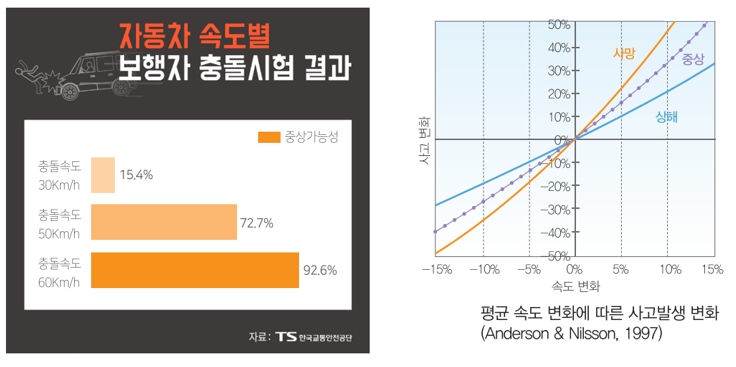 한 연구결과에 의하면 속도가 5% 감소할 때 사망사고는 20%, 부상 사고는 10% 감소했다고 해요. 한국교통안전공단이 실험한 결과 30km로 달리던 차량이 보행자와 충돌했을 때 중상가능성이 15%인데 50km달렸을 땐 72%까지 높아지는 것으로 나타났고요. 성인의 인체모형으로 진행한 실험이니 아동의 경우에는 피해가 더 치명적일 것으로 예상됩니다. 정부는 2026년까지 어린이 보호구역 내 사망자를 제로(0)화 하겠다는 목표를 제시했는데요, 야간에 스쿨존을 지나는 소수의 어린이를 보호하지 않으면 그 목표를 달성하기 어려울 겁니다.