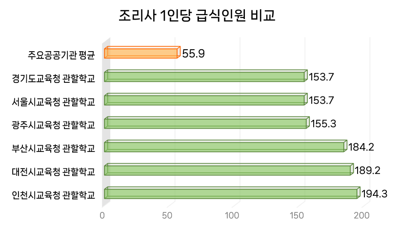 게다가 원래 학교 급식실은 다른 급식실보다 업무강도가 높기로 유명했어요. 노동자 1명이 몇인분의 음식을 만드는지 보여주는 ‘식수인원’의 수가 다른 기관보다 훨씬 높거든요. 서울대병원 등 주요 공공기관 11곳의 평균 식수인원이 66명인데요, 전국 초등학교의 평균 식수인원은 155명이나 돼요. 인천과 대전지역의 경우 1명의 조리사가 책임져야 하는 급식인원이 190명에 이릅니다. 다른 공공기관 급식실보다 학교 급식실이 업무강도가 2~3배 이상 강한데 산재 위험까지 훨씬 높은 거예요.