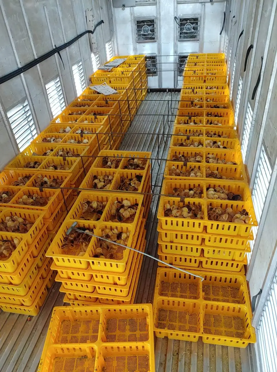 박스 당 100마리씩 (25마리씩 나눠서) 담겨 저런 차에 6-7 만수가 한 번에 이동하는데 엉겨 붙은 체온의 열기로 병아리들이 죽기 때문에 천장에서 휀을 돌려 저 옆 창문으로 더운 열을 빼주며 달린다.