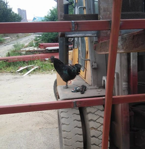 닭계장은 눈치채고 큰 지게차에 올라가 있고
