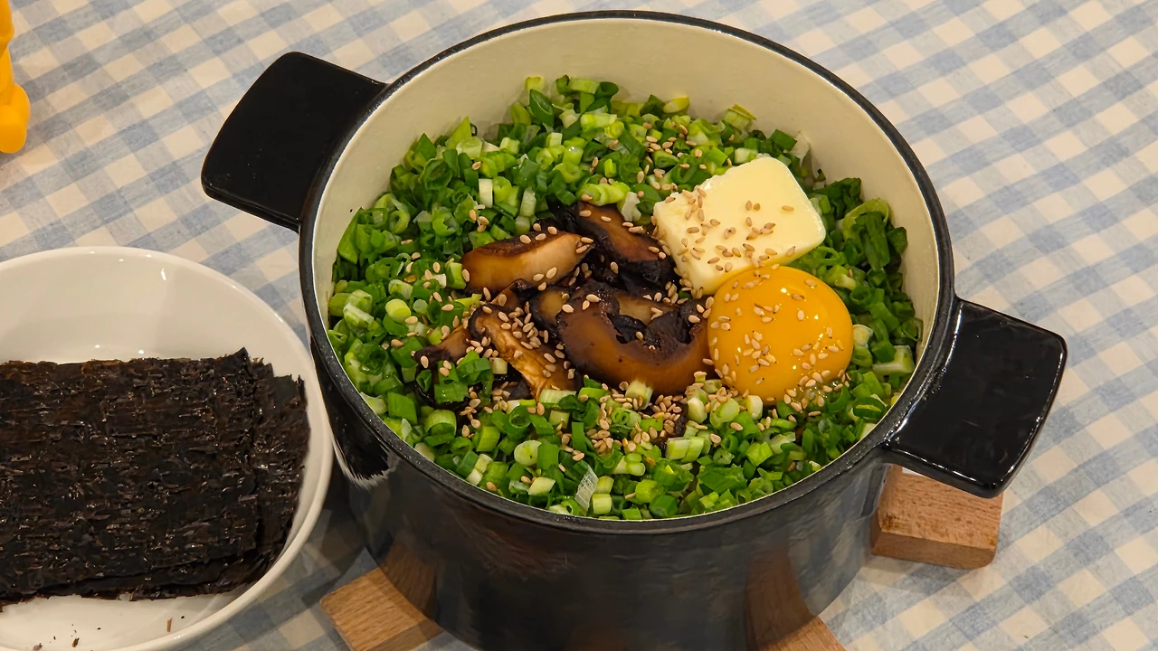 10분 뒤 밥 위에 다져둔 버섯을 올리고 뚜껑을 덮어 5분간 더 유지. 그다음 불을 끈다. 이제 다진 다시다를 넣고 밥을 한번 저은 뒤 평평하게 만든다. 그 위에 쪽파와 볶은 버섯을 예쁘게 올려 뚜껑을 덮고 10분간 뜸 들이기.