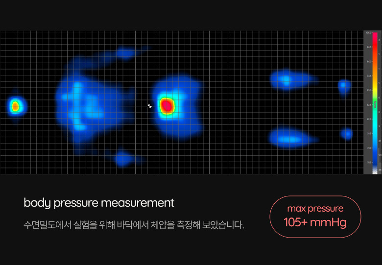 수면밀도에서 실험을 위해 바닥에서 측정한 체압 사진을 같이 보시면, 머리와 엉덩이 같이 돌출부 부위(붉은색)의 눌리고 허리(푸른색~검은색)는 뜨는 모습을 관찰할 수 있습니다.