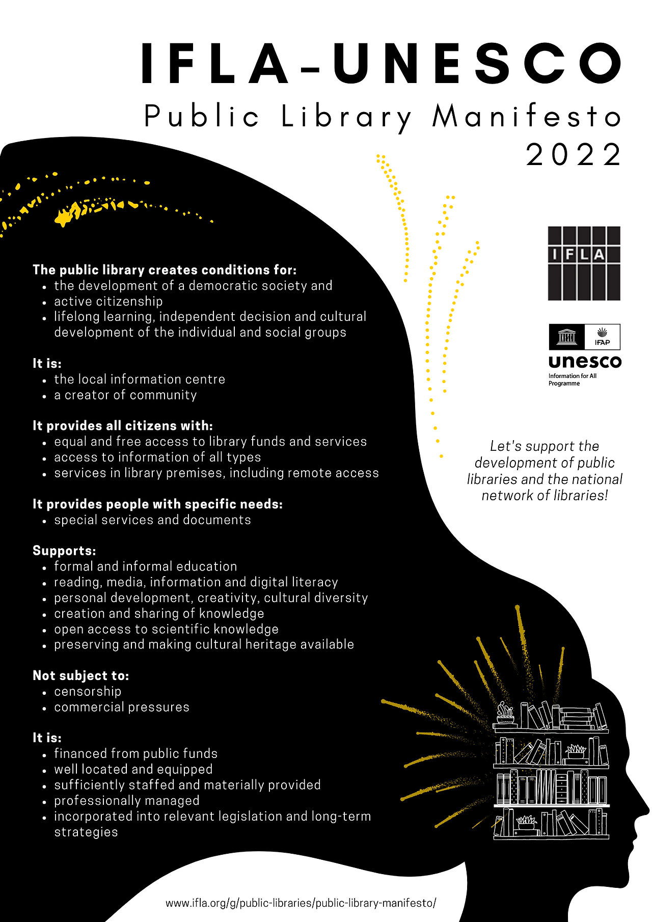 도서관은 사라지고 소멸된 기록들의 회복이자, 전쟁을 극복하는 장기적 평화를 위한 문화적 토대이며, 공존과 협력의 세계에 대한 대중의 접근과 소통을 위한 핵심 장소로 인식된 것이다. 공공 도서관을 통해 정보에 대한 평등한 접근을 열어 대중에게 평화의 인식을 심겠다는 의지는 1949년 탄생한 유네스코 공공도서관 선언(UNESCO Public Library Manifesto)을 탄생시켰다. 2022년 사회적 변화와 기술의 진보 속에서 도서관의 역할이 전후 교육 기관에서 지속가능한 발전의 주체로 전환되었지만, 평화롭고 조화로운 세계를 위한 그 도서관의 비전만큼은 여전히 유지되었다.