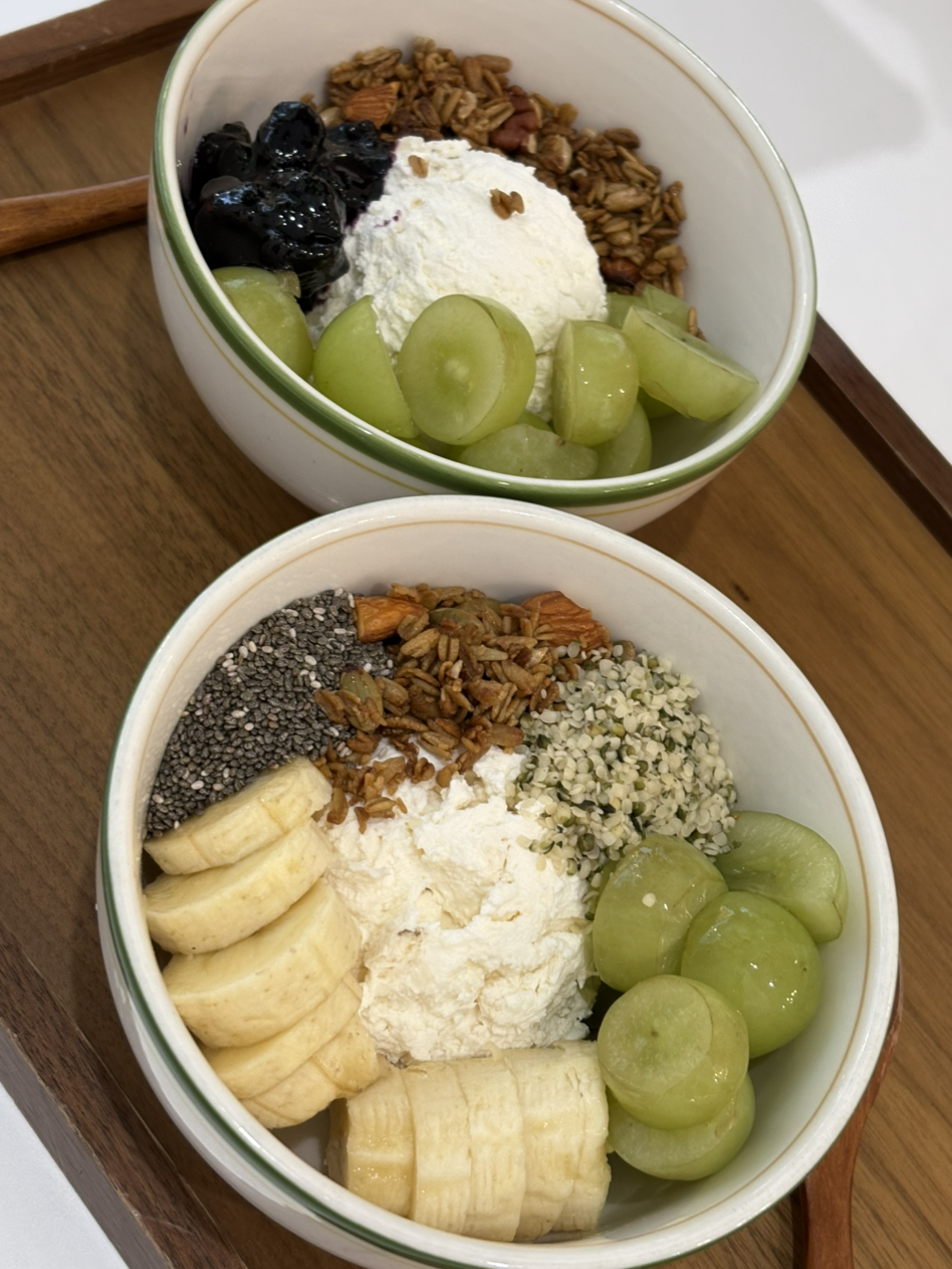 그릭 요거트는 플레인 요거트의 꾸덕한 버전이다. 내가 먹은 그릭요거트는 치아시드, 햄프시드, 청포도, 바나나, 호박씨•아몬드 같은 견과류가 들어있었다. 치아시드가 먹고 싶어서 고른 메뉴인데, 햄프시드라는 처음 보는 재료도 들어있었다.