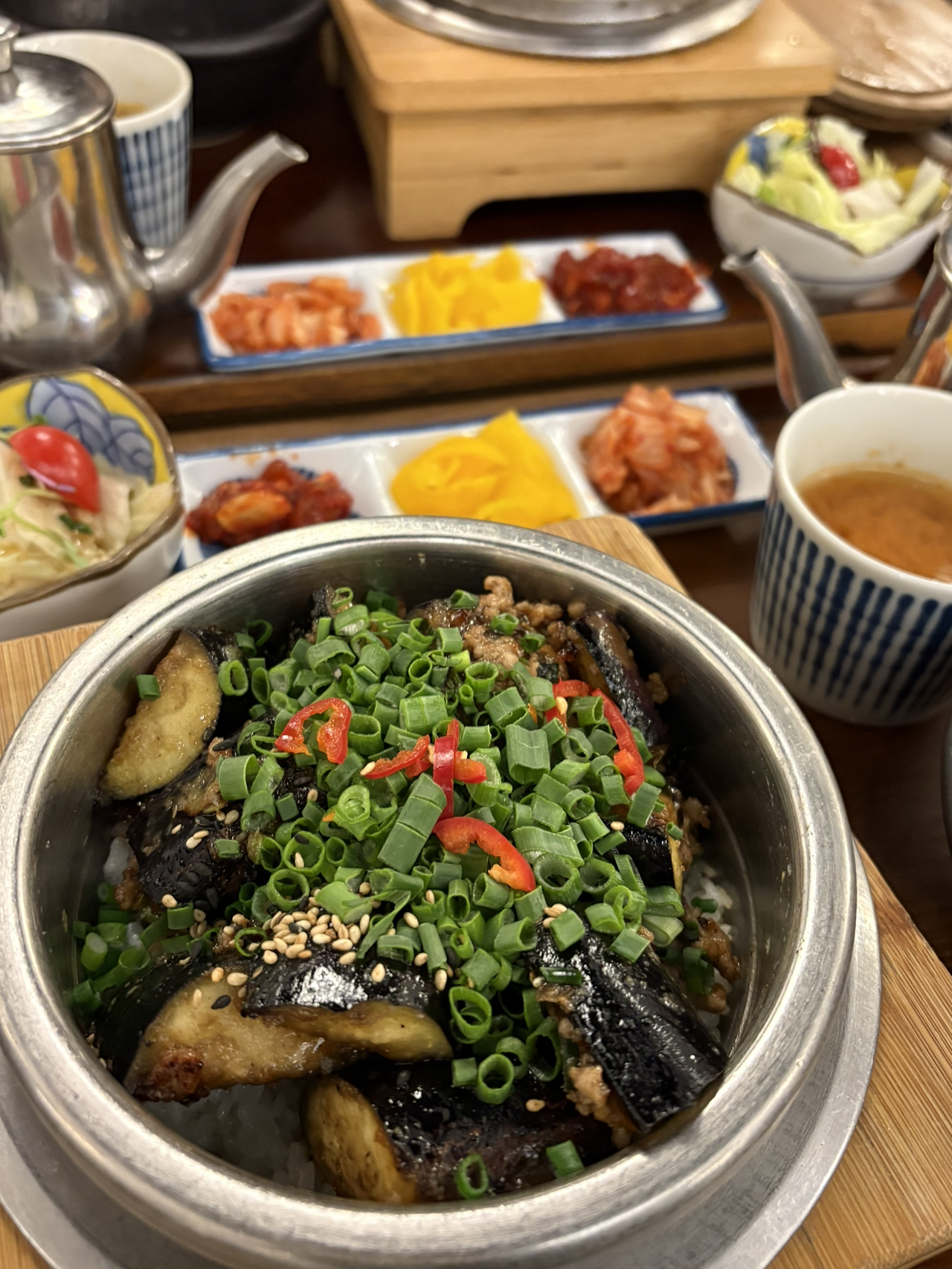 친구는 우삼겹 돌솥밥, 나는 가지 돌솥밥을 주문했다. 밥과 곁들어진 재료들을 앞접시에 옮기고 물을 부어 뚜껑을 덮었다. 누룽지를 기다리며 밥을 맛있게 먹었다. 가지는 적당히 익어서 씹는 맛이 있었고 마냥 흐물흐물하지 않았다.