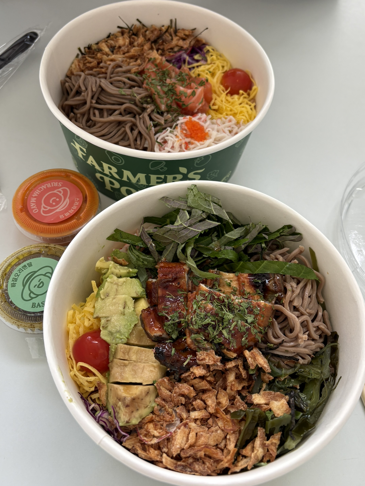 소스로 바질 오리엔탈을 선택하고 아보카도, 해조류를 추가한 내 포케는 장어와 채소의 향이 잘 어우러졌다. 친구도 연어와 계란면이 잘 어울린다고 만족했다.