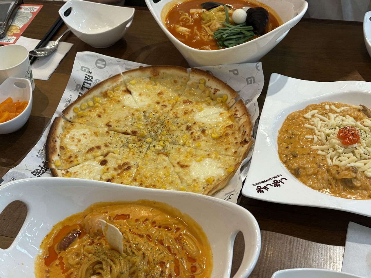 대표 메뉴 차뽕은 불맛과 함께 매운 맛이 어우러졌다. 짬뽕 국물에 젖은 양파 맛을 좋아한다. 콘치즈 피자는 얇은 도우에 올라간 치즈와 옥수수들이 잘 어울렸다. 리조또는… 전남친이 맛있다고 했던 메뉴인데 슬쩍 시켜봤다. 고기와 밥, 치즈, 크림, 살짝 올린 날치알까지 맛있었다.