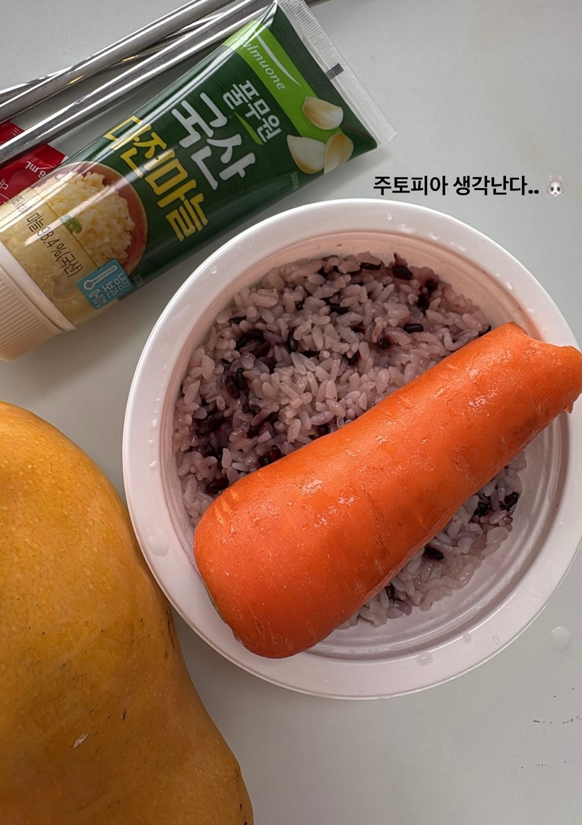어제 저녁밥은 영화 주토피아에서 주디가 당근밥 먹는 씬이 있는데 딱 그 비주얼이었다. 공유했더니 친구들이랑 부모님한테 토끼 같다는 소리를 들었는데 제일 웃긴 건 위 사진 속 친구 반응이었다. 간장과 마늘을 곁들여 먹은데다 당근도 실해서 나름 맛있었다. 후식으로 망고도 먹었다.